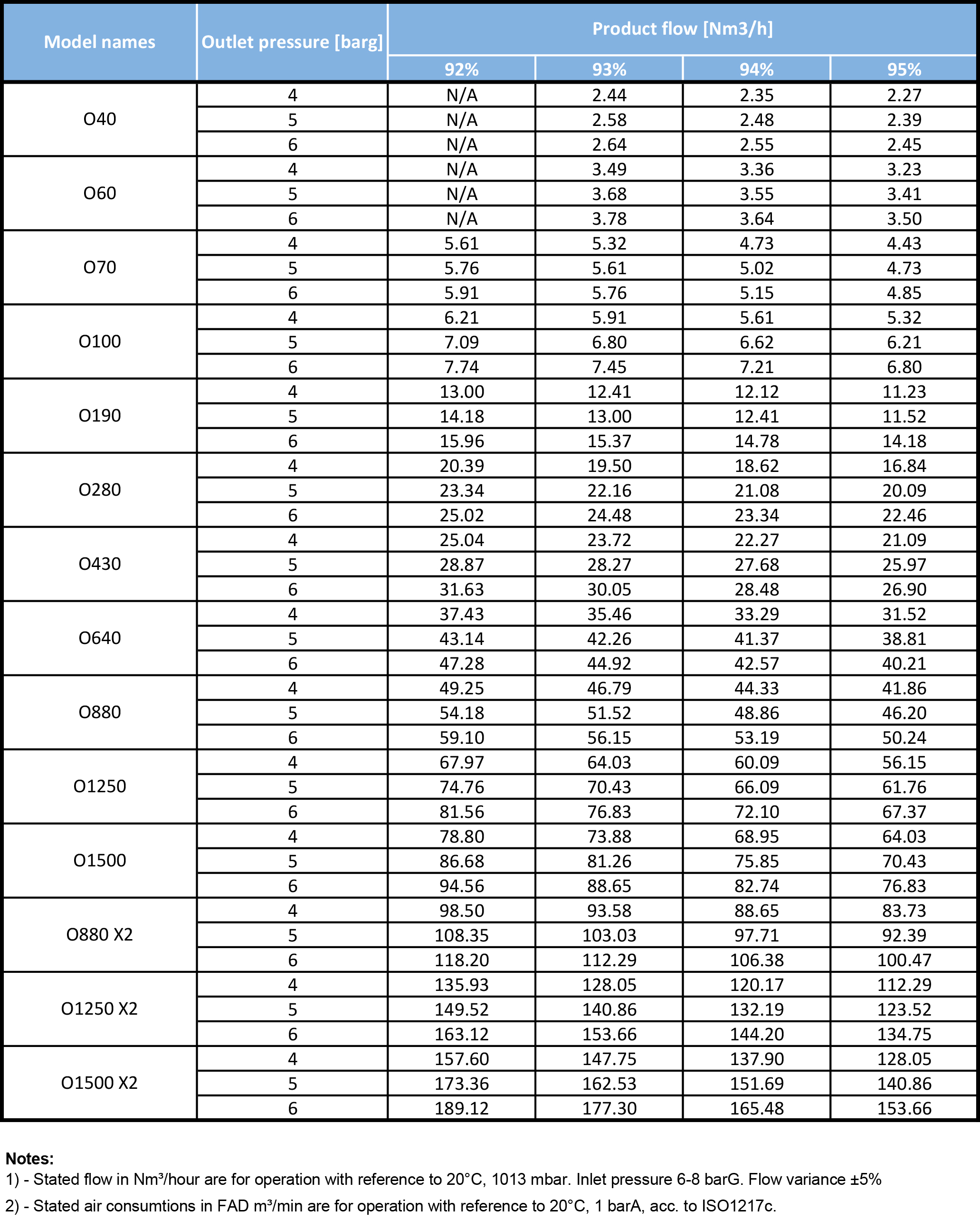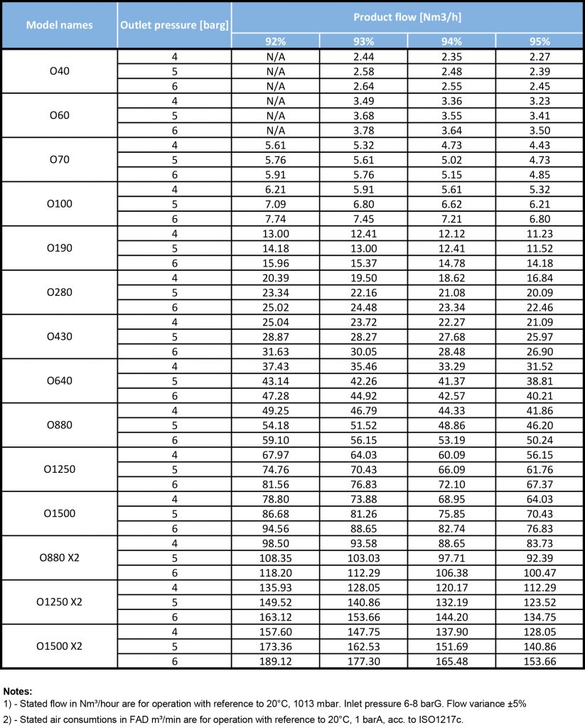 Lưu ý * 1 - Lưu lượng được xác định trong NM3 / giờ dành cho hoạt động với tham chiếu đến 20 ° C, 1013 mbar. Áp suất đầu vào 6-8 barG. Phương sai lưu lượng ± 5%.
